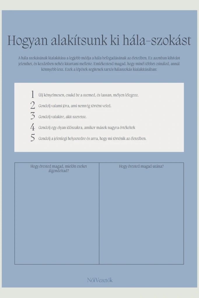Az útmutató célja, hogy a hála gyakorlása szokássá váljon, így idővel észreveszed, hogy természetesen elkezdesz a pozitív dolgokra fókuszálni. Ez nemcsak a gondolkodásmódodat formálja át, hanem a mindennapi életminőségedet is javítja.